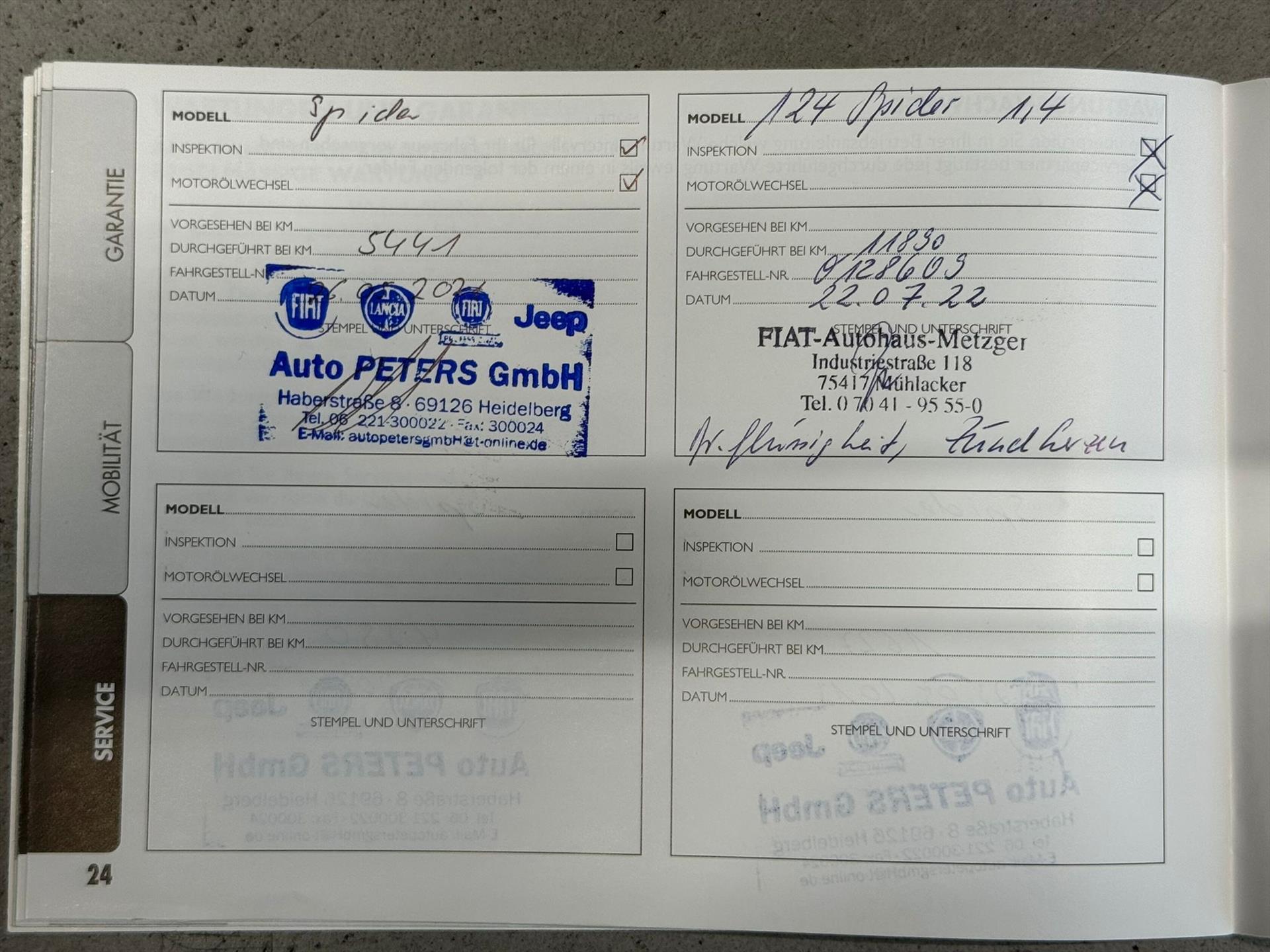 Een van origine Duits geleverd exemplaar. In dit geval was Fiat dealer Auto Peters GmbH te Heidelberg de leverende dealer aan de eerste eigenaar. Het onderhoud verliep correct en op tijd ondanks dat er door de eerste eigenaar amper met de 124 Spider gereden werd (in mei 2021 gaf de teller een magere 5500km aan). Ook zijn alle beurten netjes en correct afgestempeld in het serviceboekje alsmede alle documenten van het gepleegde onderhoud present. Onderhouden bij: 1627km , 4250km , 5441km , 11890km en 18988km. De auto werd eerst onderhouden door de Fiat dealer te Heidelberg en daarna de Fiat dealer te Muhlacker. Belangrijk voor u te weten is dat deze auto is voorzien van distributie riem welke natuurlijk qua kilometers nog lang niet toe was aan zijn interval , echter wel aan het aantal jaren. De distributie set is reeds vervangen bij de laatst uitgevoerde servicebeurt in juni 2024. De auto is nu afkomstig van eigenaar nummer “2” die de auto ook voor erbij had. Wij bieden u deze Fiat aan geheel rijklaar inclusief kleine service , Nederlandse registratie , geldige apk tot februari 2027 en Autotrust garantie pakket.