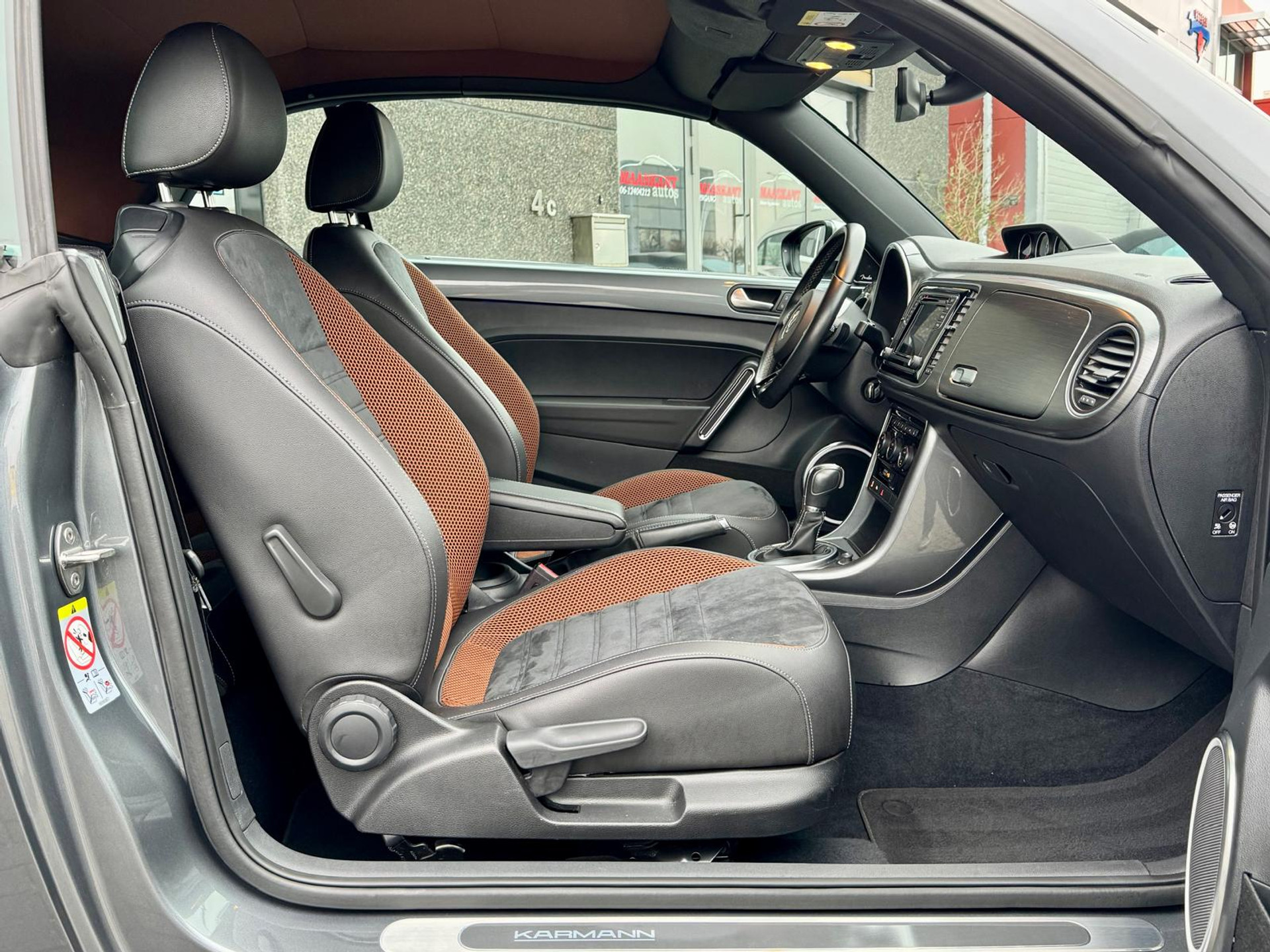 VW BEETLE LOVERS ONLY! Vol trots en enthousiasme bieden wij u aan een uniek en éénmalig exemplaar aan van de Volkswagen Beetle Cabrio afkomstig van het jaar 2017 in een wel heel exclusief jasje! Dit keer een heuse Karmann special edition in het "Platinum grey metallic" met een Sioux kleurige softtop tegenover contrasterend half leder/alcantara interieur in combinatie met brushed metal interieur afwerking! Beslist een streling voor het oog en een klassieker van de toekomst! Dit exemplaar is voorzien van de krachtige , 150pk sterke 1.4 Tsi motorisatie in combinatie met de Dsg automatische transmissie , één van de meest geliefde motor en transmissie varianten destijds verkrijgbaar. Qua uitrusting tevens voorzien van de juiste traditionele velgen , audio af fabriek , camera achter . Fender premium sound , Stoelverwarming , Parkeersensoren voor en achter , Dodehoek detectie en meer... De droom op vierwielen voor hem of haar staat bij ons voor u klaar!